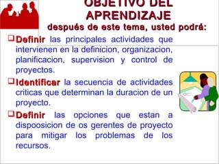 El documento presenta información sobre la gestión de proyectos. Explica conceptos clave como objetivos, alcance, equipo de proyecto y planeación. Detalla los pasos para definir objetivos generales y específicos, diseñar la estructura organizativa, y elaborar el diagrama de red que representa las actividades de un proyecto y sus relaciones. El objetivo es proveer una introducción a los principios y procesos fundamentales de la administración de proyectos.