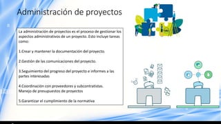 El documento describe la administración de proyectos, incluyendo sus características principales como la creación y mantenimiento de documentación, la gestión de comunicaciones y el seguimiento del progreso. Explica las cinco fases de la administración de proyectos: iniciación, planificación, ejecución, monitoreo y control, y cierre. La administración de proyectos ayuda a garantizar que los proyectos se completen a tiempo, dentro del presupuesto y con la calidad requerida.