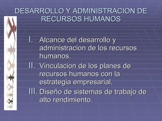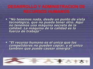 El documento describe el alcance y objetivos de la administración de recursos humanos, incluyendo construir un entorno de excelencia para habilitar a la fuerza laboral, comunicar la importancia de cada empleado para la calidad total, y fomentar el trabajo en equipo y la delegación de autoridad. También destaca la importancia de alinear los planes de recursos humanos con la estrategia empresarial para lograr objetivos de calidad.
