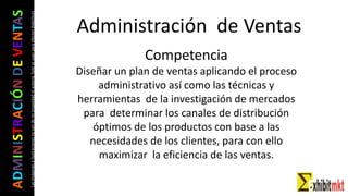 El documento describe los conceptos clave de la administración de ventas. Se divide en cuatro unidades que cubren la organización empresarial, la investigación de mercados, la gestión de ventas y el sistema de distribución comercial. Además, explica los principios básicos de la mercadotecnia como la orientación al cliente y la investigación y desarrollo.