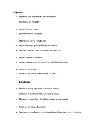 El documento describe un nuevo restaurante llamado "Continental Mup!" que servirá platos de los cinco continentes en secciones separadas. La visión es crear el mejor lenguaje publicitario y ser líderes en el mercado mediante una idea creativa e innovadora. La misión es ofrecer productos alimenticios de calidad, generar valor para los accionistas y expandir la cadena a nivel nacional.