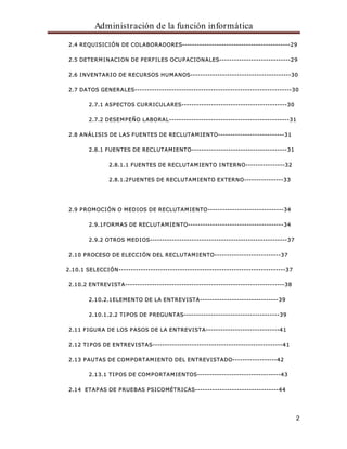 El documento describe la organización y funciones de un departamento de informática. Explica los roles y responsabilidades de un director de informática, gerente de informática, jefe de departamento de redes, administradores de sistemas, y otros. También cubre temas como el reclutamiento de personal, estándares y procedimientos, seguridad física y de la información, y mantenimiento preventivo y correctivo de equipos.