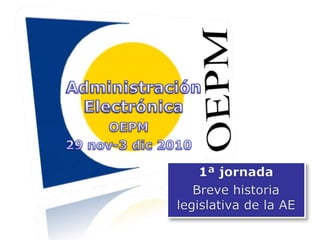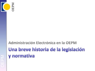 Este documento presenta una breve historia de la legislación sobre administración electrónica en España desde 1978 hasta 1999, destacando leyes clave como la Ley 30/1992 sobre procedimiento administrativo, la Ley 11/2007 sobre acceso electrónico y la Directiva 1999/93/CE sobre firma electrónica. También cubre la Ley Orgánica 15/1999 sobre protección de datos, que regula el tratamiento de datos personales independientemente del soporte.