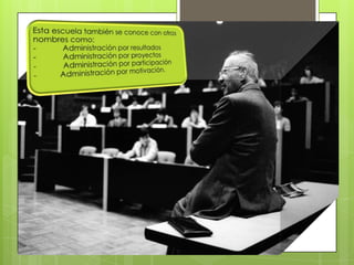 El documento describe las contribuciones de diferentes teóricos a las escuelas clásica y humanística de la administración. La escuela clásica se centró en métodos científicos de organización del trabajo, mientras que la escuela humanística consideró el elemento humano como lo más importante y estudió factores psicológicos. Teóricos como Elton Mayo, Mary Parker Follett y Chester Bernard realizaron estudios pioneros sobre las motivaciones humanas y la importancia de las relaciones humanas en el trabajo.
