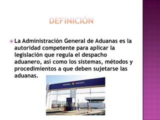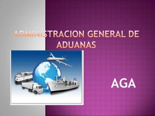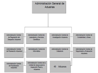 La Administración General de Aduanas es la autoridad competente en México responsable de aplicar la legislación aduanera y regular el despacho de mercancías de comercio exterior. Está integrada por varias administraciones centrales y supervisa aduanas en todo México. Determina impuestos a la importación y exportación de acuerdo con la ley, y se encarga de verificar mercancías en transporte y vehículos procedentes del extranjero.