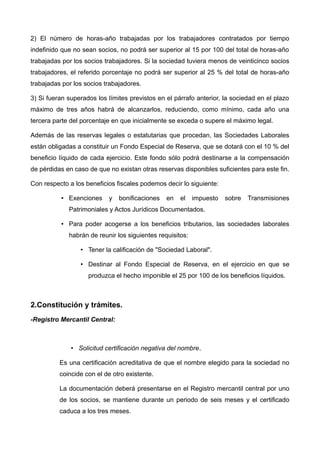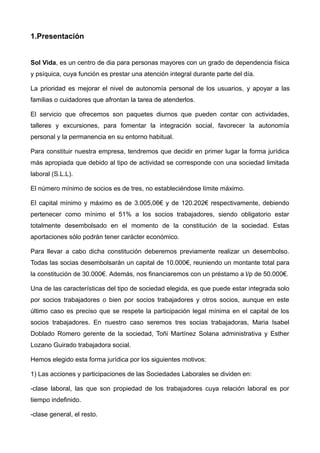 El documento presenta la constitución de una sociedad limitada laboral llamada "Sol Vida" que ofrecerá servicios de centro de día para personas mayores dependientes. La sociedad estará formada por 3 socias trabajadoras que aportarán un capital social total de 30.000€. Se describen los pasos para la constitución de la sociedad como la obtención de certificados, la escritura pública ante notario, y los trámites ante el registro mercantil y hacienda.
