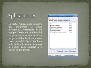 El documento describe dos formas de acceder a información sobre los programas y procesos que se están ejecutando en una computadora. La ficha de Aplicaciones muestra los programas actualmente en ejecución y su estado, y permite iniciar o cambiar a un programa. La pestaña de Procesos lista todos los procesos técnicos que se están ejecutando actualmente con nombres que pueden no ser identificables.