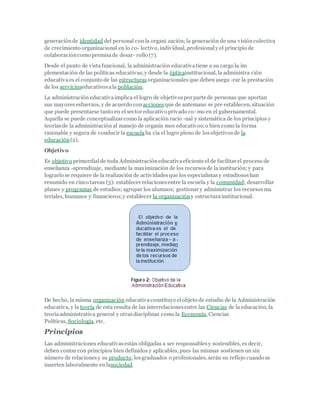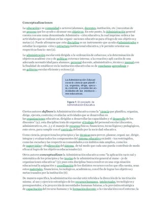 El documento describe los conceptos fundamentales de la administración educativa. Se define como la aplicación sistemática de principios de administración general al manejo de organizaciones educativas, con el objetivo de facilitar el proceso de enseñanza-aprendizaje. La administración educativa implica funciones como la planificación, organización, dirección y control de recursos para cumplir los objetivos institucionales.