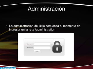La administración del sitio comienza en la ruta /administration, donde se muestra una barra de menús con opciones para controlar el sitio como el dashboard, un constructor de menús, ver el sitio, y añadir extensiones o plugins comprados. El dashboard por defecto incluye opciones para modificar y el constructor de menús permite añadir más opciones al dashboard.