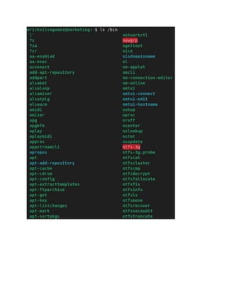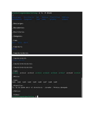 El documento describe un laboratorio sobre sistemas operativos y administración de servidores. Contiene 17 pasos para ejecutar comandos en la línea de comandos como listar archivos en diferentes directorios, cambiar de directorio, verificar la ubicación actual, copiar archivos y crear directorios anidados.