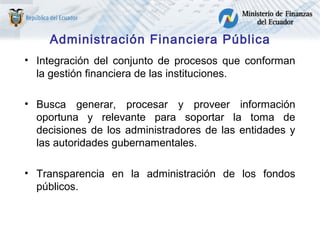 La administración financiera pública busca generar información oportuna para la toma de decisiones de los administradores, mediante la integración de procesos como el presupuesto, la contabilidad y la tesorería. Se sustenta en criterios como la centralización normativa y descentralización operativa, siendo un sistema integral y uniforme para todas las instituciones públicas.