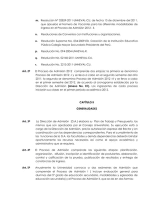 El documento norma el proceso de admisión, que incluye diferentes modalidades de ingreso como deportistas destacados, víctimas del terrorismo, personas con discapacidad y egresados de colegios secundarios. Se describen los requisitos para la inscripción, el examen de selección general y las modalidades de exoneración del examen. El objetivo es seleccionar postulantes