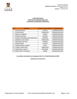 Este documento presenta la lista de 12 estudiantes admitidos en el Liceo Matovelle para el año 2013. Los estudiantes fueron admitidos a diferentes grados desde prekinder hasta noveno grado. Las órdenes de matrícula para los estudiantes admitidos se entregarán del 12 al 14 de diciembre de 2012.
