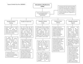 El documento describe las filosofías y contribuciones de varios pensadores clave en el campo de la calidad, incluyendo a Deming, Juran, Ishikawa y Crosby. Se destaca que promovieron enfoques como el diseño robusto, el uso de diagramas como el de Ishikawa y Pareto, y la idea de que la calidad no debe verse como un costo sino una inversión rentable. También se menciona que consideraron factores como las personas y los clientes como elementos clave para lograr la calidad.