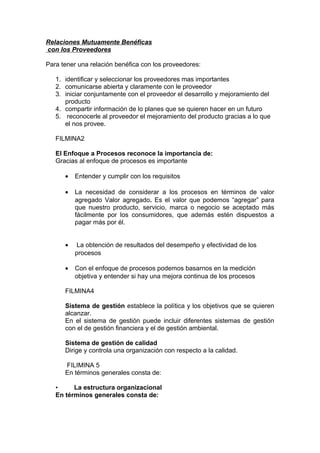 Para tener una relación beneficiosa con los proveedores, una organización debe: 1) identificar y seleccionar a los proveedores más importantes, 2) comunicarse abiertamente y claramente con los proveedores, y 3) iniciar conjuntamente con los proveedores el desarrollo y mejoramiento de los productos.