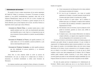 El documento trata sobre la administración de inventarios. Explica que la administración de inventarios busca minimizar la inversión en inventarios y asegurar que la empresa cuente con suficientes inventarios para satisfacer la demanda. También presenta diferentes técnicas para la administración de inventarios como el sistema ABC, el cálculo del lote económico y el punto de reordenación. Finalmente, incluye ejercicios prácticos sobre la aplicación de estas técnicas.