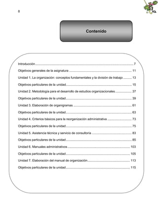 Este documento contiene 7 unidades sobre la asignatura de Administración III. La Unidad 1 discute conceptos fundamentales de organización como la división del trabajo, y analiza objetivos, estructuras formales e informales y cultura organizacional. Los objetivos de esta unidad son que los estudiantes analicen teorías de organización y estructuras organizacionales, y valoren el papel del analista de sistemas administrativos.