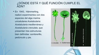 1. El documento describe varios experimentos e investigaciones sobre la estructura y replicación del ADN, incluyendo los experimentos de Hämmerling, Gurdon y sobre la meiosis.