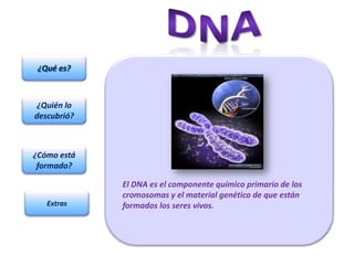 El documento describe los componentes básicos del ADN: fosfatos, azúcares y bases nitrogenadas. Explica que el ADN está formado por una cadena de estas moléculas unidas en un orden específico que contiene la información genética de los seres vivos. Además, menciona que el ADN fue descubierto en 1869 por el biólogo suizo Johann Friedrich Miescher.
