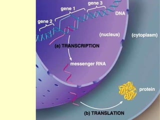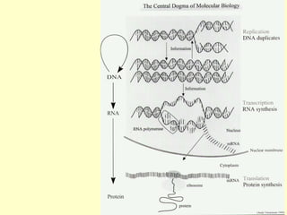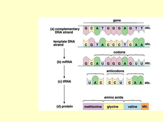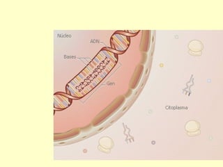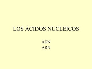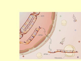 Los ácidos nucleicos ADN y ARN almacenan y transmiten la información genética de los organismos. El ADN está formado por dos cadenas entrelazadas que contienen las instrucciones hereditarias, mientras que el ARN participa en la expresión de genes transportando mensajes desde el ADN hasta los ribosomas para la síntesis de proteínas. La información genética se transmite a través de la replicación del ADN, la transcripción del ADN a ARN y la traducción del ARN en proteínas.