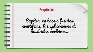 Este documento resume las características y aplicaciones de los ácidos nucleicos ADN y ARN. Explica que el ADN almacena y transmite la información hereditaria a través de las generaciones, mientras que el ARN ayuda en la síntesis de proteínas. También describe los diferentes tipos de ADN y ARN y sus funciones, así como las aplicaciones del ADN y el ARN en la medicina y otros campos.