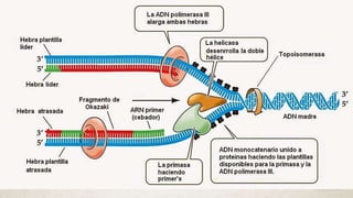 El documento describe la estructura y replicación del ADN. Explica que el ADN tiene una estructura primaria de nucleótidos unidos por enlaces fosfodiéster y una estructura secundaria de doble hélice descubierta por Watson y Crick. También describe el proceso de replicación del ADN mediante el cual cada cadena se copia formando dos moléculas de ADN hijas.