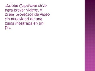 Adobe Captivate permite grabar videos sin necesidad de una cámara integrada en la PC. Para crear un video, es necesario conocer el tamaño de la pantalla para configurar el proyecto en Captivate. Una vez iniciado el proyecto, se puede hacer clic en el botón de grabación para que Captivate tome fotos miniatura mientras se trabaja en la PC. Finalmente, los videos creados se pueden subir a YouTube y enlazar en blogs.