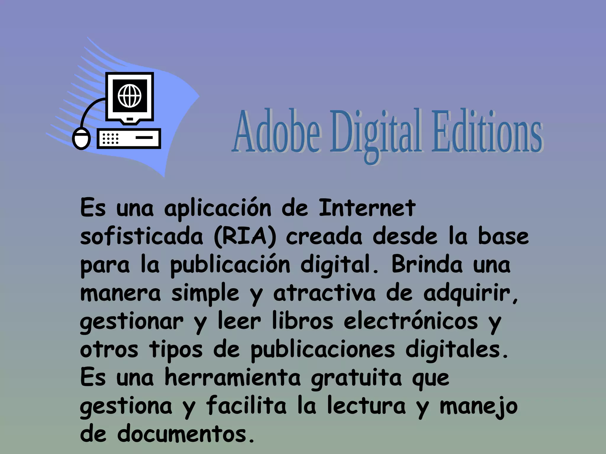 Adobe Digital Editions es una aplicación gratuita para gestionar y leer libros electrónicos y otros documentos digitales de forma sencilla y atractiva, que permite descargar e instalar contenido de forma rápida, portarlo entre dispositivos y cuenta con funciones avanzadas como marcadores, préstamos de libros y compatibilidad con múltiples formatos y plataformas.