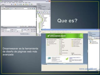 Dreamweaver es una herramienta avanzada para el diseño de páginas web que permite ocultar el código HTML al usuario y tiene un gran poder de personalización. Aunque no soporta completamente HTML5 y CSS3 en el modo de diseño, sí permite previsualizaciones en vivo con estas tecnologías. Dreamweaver también facilita la creación de páginas web mediante etiquetas como <html>, <head>, <title> y <body>.