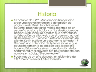 Este documento describe Adobe Dreamweaver CS5, un programa de edición de páginas web. Explica que Dreamweaver se creó originalmente en 1997 para facilitar la construcción de sitios web. Luego resume las funciones principales de Dreamweaver CS5, como editar HTML, usar diferentes tecnologías web, y diseñar y programar páginas rápidamente. Finalmente, resalta algunas ventajas como su compatibilidad con CSS de Adobe y lenguajes de programación, y desventajas como su curva de aprendizaje y costo.