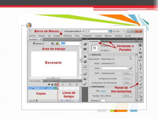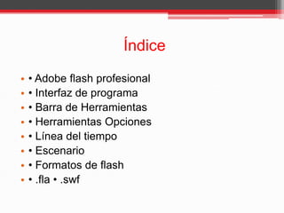 Este documento describe el programa Adobe Flash, incluyendo su interfaz, herramientas como la barra de herramientas, línea de tiempo y escenario. También explica los formatos .fla y .swf, siendo .fla el archivo de trabajo y .swf el archivo resultante optimizado para reproducción.