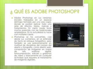 Adobe Photoshop es un programa de edición de imágenes que permite mejorar, retocar y manipular fotografías de manera digital. Inicialmente trabajaba con una sola capa pero ahora lo hace con múltiples capas. Se usa ampliamente en diseño, fotografía, diseño web y cualquier actividad que requiera el tratamiento de imágenes digitales. Los hermanos Thomas y John Knoll crearon el programa originalmente llamado Display y luego ImagePro antes de ser adquirido por Adobe y lanzado como Photoshop en 1990.