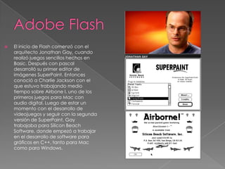 El desarrollo de Flash comenzó con Jonathan Gay creando juegos sencillos en los años 80. Más tarde, fundó FutureWave Software y desarrolló SmartSketch y Future Splash Animator para permitir animaciones en la web. En 1996, Macromedia compró FutureWave y lanzó la primera versión de Flash como Macromedia Flash 1.0, permitiendo a los diseñadores crear contenido interactivo y gráficos vectoriales para la web. Flash se ha actualizado continuamente desde entonces y ahora es propiedad de Adobe.