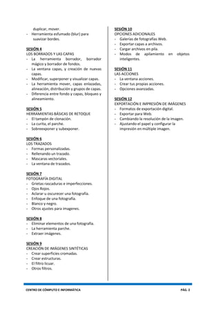 Este sílabo introduce el curso básico de Adobe Photoshop de 26 horas. El curso enseña habilidades básicas de edición y retoque de imágenes como ajustes de color, uso de capas, herramientas de selección y borrado, y exportación de imágenes para impresión y web. El curso está dividido en 12 sesiones que cubren estas herramientas y técnicas a través de ejercicios prácticos.