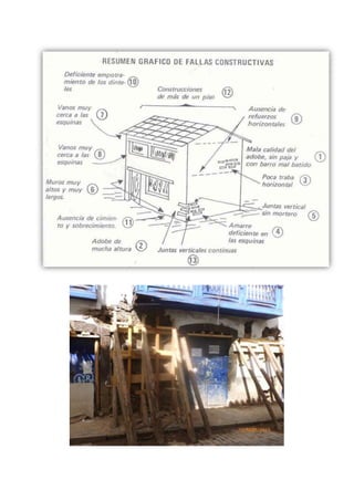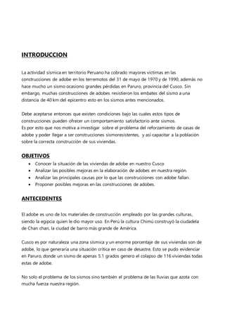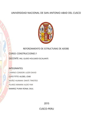 Este documento presenta las recomendaciones para el reforzamiento estructural de viviendas de adobe en la región del Cusco, Perú. Detalla los objetivos, antecedentes, causas comunes de falla, y pasos recomendados para una construcción sismorresistente, incluyendo el proceso de fabricación de adobes, cimientos, paredes, contrafuertes, y refuerzos verticales. También resume una prueba a escala realizada que mostró la importancia de contrafuertes y muros resistentes, concluyendo