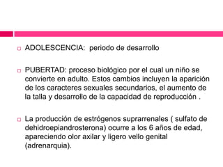 La pubertad es un proceso biológico en el que un niño se convierte en adulto a través de cambios físicos, psicológicos y sociales. Estos cambios incluyen el desarrollo de los caracteres sexuales secundarios como el aumento de tamaño de los senos en las niñas y los testículos en los niños, así como cambios en la voz y el crecimiento. La pubertad también implica cambios en el pensamiento y la identidad a medida que los adolescentes desarrollan la capacidad de pensamiento abstracto.