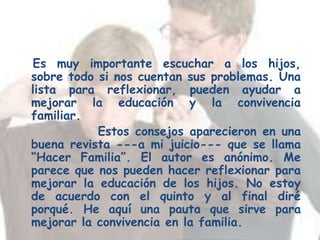 Este documento presenta quince consejos de un adolescente a sus padres para mejorar la educación y la convivencia familiar. Los consejos incluyen escuchar activamente a los hijos, tratarlos con la misma cordialidad que a los amigos, no cambiar de opinión constantemente, no prometer cosas malas, no compararlos con otros hijos, y expresar amor y aprecio de forma sincera. El objetivo general es fomentar la comunicación y el respeto mutuo entre padres e hijos durante la adolescencia.