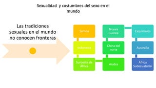 El documento describe diferentes tradiciones sexuales y costumbres matrimoniales como la poligamia y la poliandria en diversas culturas alrededor del mundo, incluyendo regiones de África, Asia, Oceanía y América. Señala que las tradiciones ayudan a definir la identidad cultural de un grupo y varían significativamente entre regiones, desde prácticas poligámicas hasta la falta de importancia dada a la virginidad de las novias.