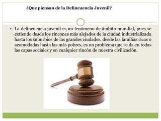 La delincuencia juvenil es un problema mundial que afecta a todas las clases sociales. Algunas de las causas principales incluyen la negligencia de los niños debido a las presiones laborales de los padres, familias desestructuradas incapaces de transmitir normas como padres drogadictos o ausentes, y factores sociales como la pobreza. Para prevenir la delincuencia juvenil, es necesario fortalecer a las familias como unidad central para la crianza de los niños y desarrollar políticas que promuevan entornes familiares estables