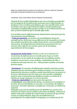 Este documento contiene información sobre las características de la adolescencia desde perspectivas pedagógicas y psicológicas. Se divide la adolescencia en tres etapas y describe los cambios físicos, cognitivos, emocionales y de comportamiento que ocurren en cada etapa. También analiza las relaciones del adolescente con sus padres y amigos, así como sentimientos comunes como la inseguridad y la angustia. Los expertos cuyas opiniones se citan son Arturo Ramo García, Isabel Menéndez Benavente y Carlos Clavell.