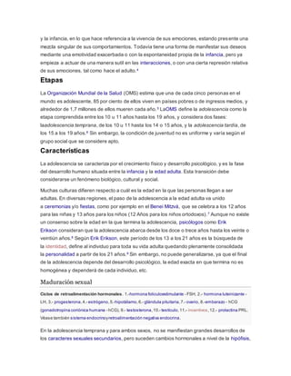 La adolescencia es el período de transición entre la niñez y la edad adulta que comienza con la pubertad entre los 10-12 años y termina entre los 19-21 años. Es un período de cambios físicos, emocionales y psicológicos importantes donde los adolescentes descubren su identidad e independencia. La Organización Mundial de la Salud divide la adolescencia en temprana (10-14 años) y tardía (15-19 años).