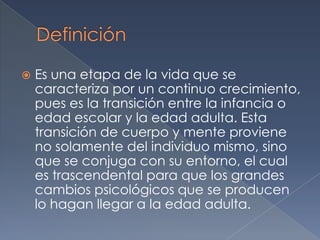 Este documento define la adolescencia como la transición entre la infancia y la edad adulta, caracterizada por grandes cambios físicos y psicológicos. Explica que la adolescencia dura desde los 13 hasta los 21 años y depende de la madurez individual. Además, señala que una de cada cinco personas en el mundo es adolescente y que la Organización Mundial de la Salud define la adolescencia como el período entre los 11 y 19 años. Finalmente, detalla algunos de los cambios físicos que ocurren durante la adolescencia temprana y tardía en