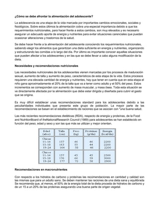 El documento proporciona recomendaciones sobre la alimentación adecuada para adolescentes. Explica que durante esta etapa se requieren altos niveles de energía y nutrientes para apoyar el crecimiento y desarrollo. Recomienda incluir leche, carnes, huevos, cereales, frutas y verduras en las comidas, así como beber suficiente agua. Además, sugiere estructurar la alimentación en cinco comidas al día, incluyendo un desayuno importante.