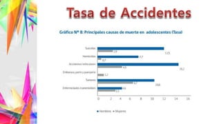 El documento describe las características físicas, intelectuales, psicológicas y sociales propias de la etapa de la adolescencia entre los 10 y 19 años, así como los principales factores de riesgo como embarazos precoces, enfermedades de transmisión sexual, accidentes, sedentarismo, problemas alimenticios, depresión, violencia, consumo de drogas y alcohol, abandono escolar y sobreprotección o autoritarismo parental. Se proponen diversas acciones para prevenir o abordar estos riesgos, como educación sexual