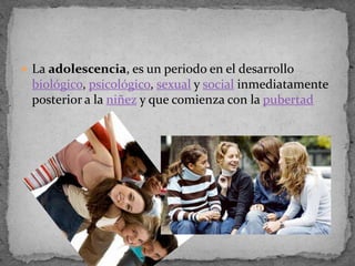 La adolescencia es un periodo de desarrollo entre la niñez y la edad adulta caracterizado por cambios físicos, psicológicos y sociales. Los primeros cambios en las niñas son el desarrollo de los senos entre los 10 y 12 años, mientras que en los varones los testículos aumentan de tamaño debido a la proliferación de los túbulos seminíferos. La adolescencia también incluye un rápido crecimiento, aumento de peso y desarrollo muscular, así como la maduración sexual.