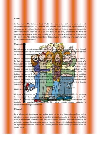 La adolescencia es el período entre los 10-19 años caracterizado por cambios físicos, psicológicos y emocionales. En esta etapa, los jóvenes experimentan la pubertad y la transición hacia la adultez mientras descubren su identidad. Fisiológicamente, la pubertad conlleva cambios hormonales y el desarrollo de características sexuales secundarias como el crecimiento mamario en mujeres y vello corporal en ambos sexos.