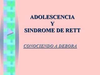 Este documento presenta información sobre el Síndrome de Rett. Explica que es un trastorno neurológico que afecta principalmente a niñas y causa retrasos en el desarrollo, pérdida de habilidades motoras y problemas de comunicación. Describe las características, etapas de evolución, diagnóstico, tratamiento, terapias y estrategias educativas recomendadas para estudiantes con este síndrome. También incluye el caso de una adolescente llamada Debora que vive con este trastorno.