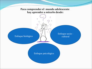 Este documento describe los diferentes enfoques para comprender la adolescencia: biológico, psicológico y socio-cultural. La adolescencia se caracteriza por alcanzar la etapa final del crecimiento con el comienzo de la capacidad de reproducción, la asunción de una posición sexual y la separación de los padres, iniciando la inserción en el grupo de los adultos. También se producen "duelos" por el cuerpo cambiante, los roles infantiles perdidos y la necesidad de construir una identidad propia.