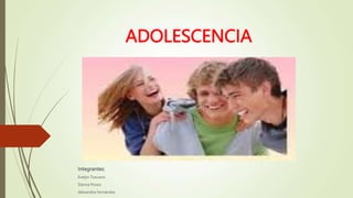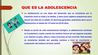 La adolescencia es una etapa de transición entre la niñez y la adultez que se caracteriza por grandes cambios físicos, cognitivos y emocionales. Estos cambios incluyen la pubertad, el desarrollo del razonamiento abstracto, y la preparación para los roles de adulto. Los adolescentes experimentan cambios en la identidad y las emociones que pueden generar conflictos si no son bien gestionados. Problemas comunes en la adolescencia incluyen dificultades escolares, problemas familiares, trastornos alimenticios, embaraz