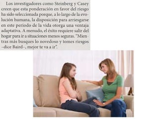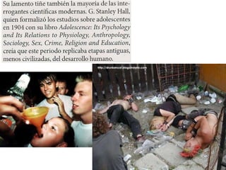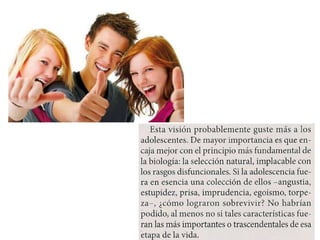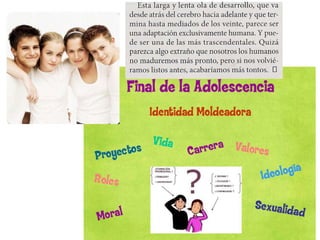 La adolescencia es una etapa de transición entre la niñez y la adultez que se caracteriza por cambios físicos y psicológicos debido a la pubertad. Durante la pubertad, el cuerpo experimenta cambios hormonales que conducen a modificaciones en los órganos sexuales y otras partes del cuerpo, preparándolo para la reproducción. Estos cambios físicos traen consigo incertidumbre e inestabilidad emocional para los adolescentes.
